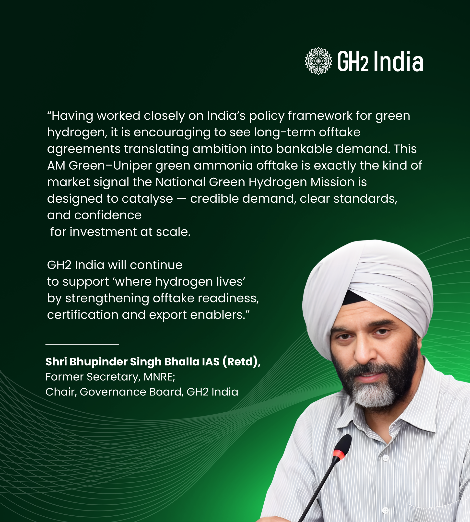 Reflecting on the broader policy and ecosystem implications, Shri Bhupinder Singh Bhalla, IAS (Retd.), Former Secretary, MNRE and Chair, Governance Board, GH2 India, noted that such agreements represent the kind of credible market signals required to scale India’s green hydrogen ambitions linking policy intent with commercial demand and investor confidence.