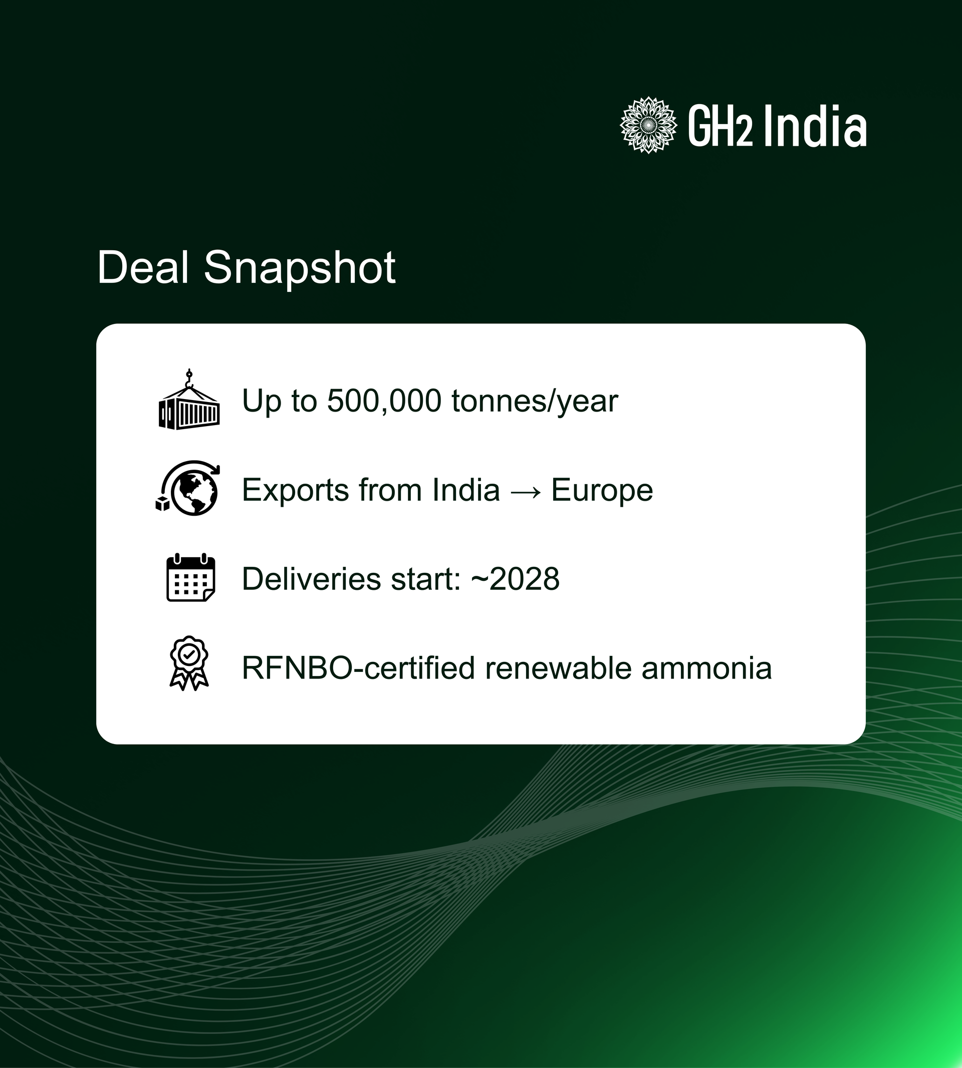 The partnership strengthens the emergence of an India–Europe green hydrogen corridor, with renewable ammonia expected to play a critical role in decarbonising hard-to-abate sectors such as power generation, chemicals, and heavy industry. First deliveries under the agreement are expected to commence around 2028, subject to project development and commissioning timelines.
