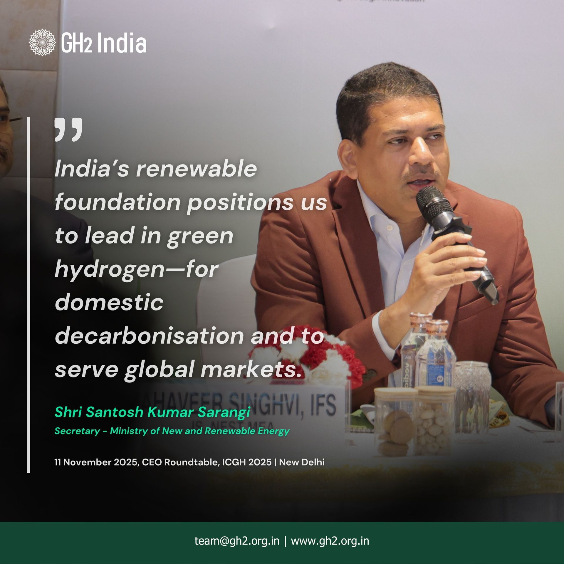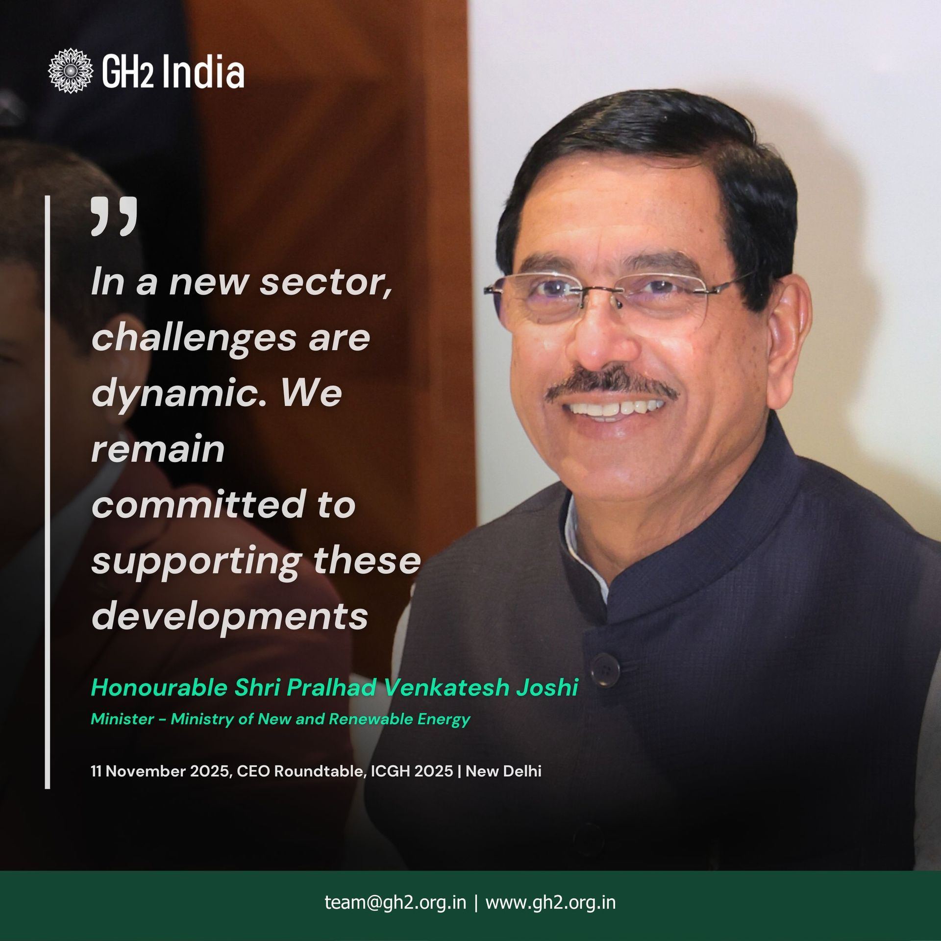 11 November 2025 - At the International Conference on Green Hydrogen (ICGH) 2025, GH2 India convened a high-level CEO Roundtable chaired by the Hon’ble Minister for New & Renewable Energy, Shri Pralhad Joshi, with Shri Santosh Kumar Sarangi, Secretary, MNRE. Senior officials from SECI, NGHM and MEA joined top developers and electrolyser manufacturers for a candid, solutions-focused dialogue on accelerating India’s green hydrogen transition.